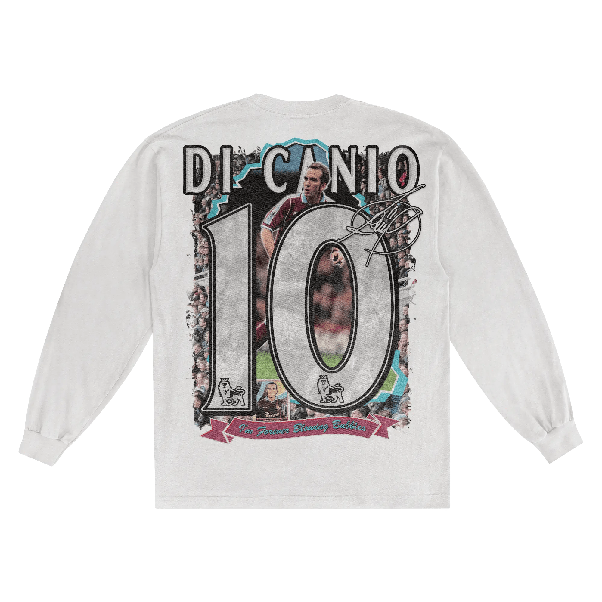 Long sleeved cotton t-shirt with oversized Paolo Di Canio inspired front and back print  featuring graphics inspired by the West Ham United maverick. THAT volley against Wimbledon 😤. Perfected cut for that iconic slightly oversized, boxy fit with a dropper shoulder. It's recommended to stay true to size for an intended slightly oversized fit.