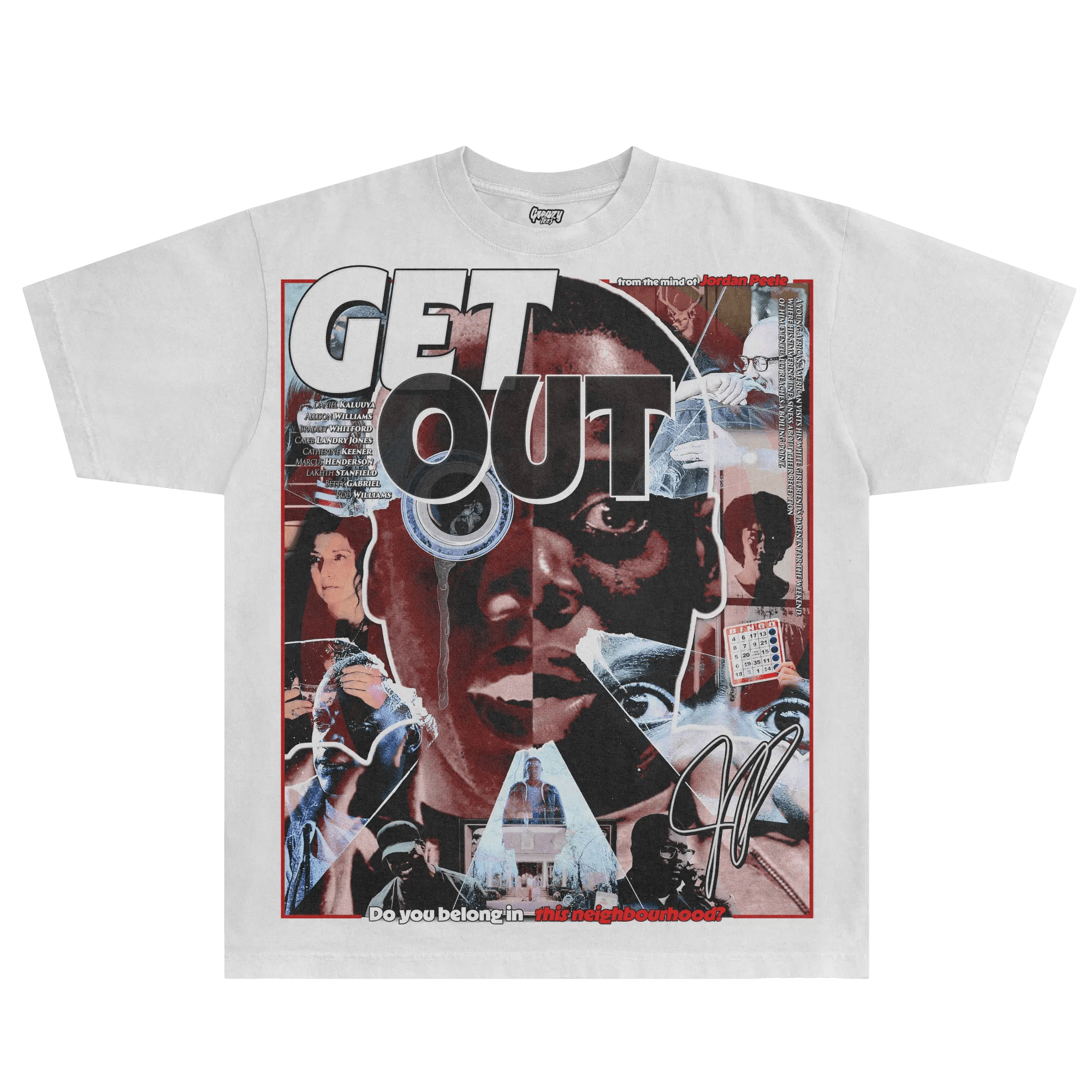 Short sleeve cotton t-shirt with oversized Get Out inspired front and back print featuring graphics inspired by the 2017 psychological thriller. Not often does a film capture such an eery feeling throughout, but Jordan Peele struck gold with this one. A thought-provoking masterpiece sprinkled with a dash of dark humour. Perfected cut for that iconic slightly oversized, boxy fit with a dropper shoulder. It's recommended to stay true to size for an intended slightly oversized fit.