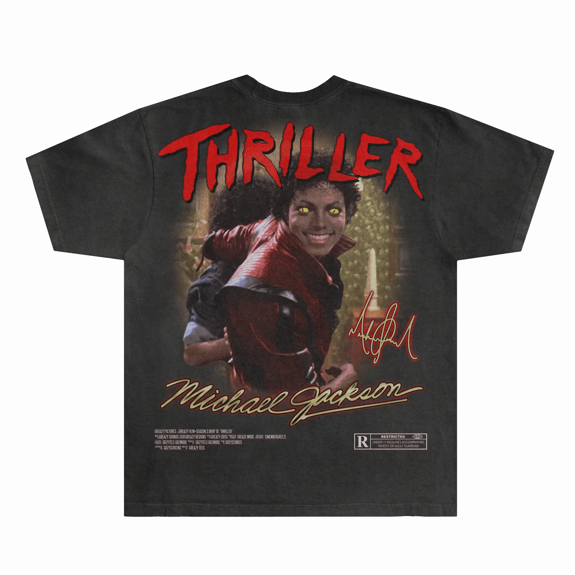 Short sleeve cotton t-shirt with Thriller front print featuring graphics inspired by the 1983 classic from Michael Jackson. Probably the greatest Halloween song ever made, with an iconic music video to match. Perfected cut for that iconic slightly oversized, boxy fit with a dropper shoulder. It's recommended to stay true to size for an intended slightly oversized fit.
