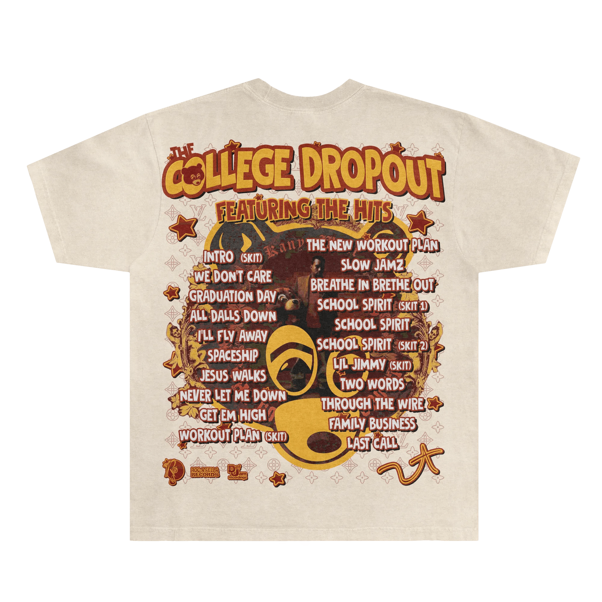 Short sleeve cotton t-shirt with The College Dropout front & back print featuring graphics inspired by the 2004 classic debut album from Kanye West. The one that started it all, Kanye's debut album is a certified masterpiece. Perfected cut for that iconic slightly oversized, boxy fit with a dropper shoulder. It's recommended to stay true to size for an intended slightly oversized fit.