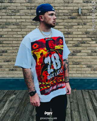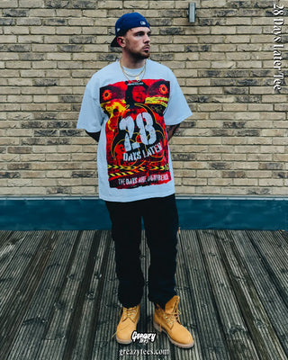 Short sleeve cotton t-shirt with oversized 28 Days Later inspired front and back print featuring graphics inspired by the 2002 post-apocalyptic horror film. Those unsettling early scenes of a deserted central London are a legendary piece of UK cinema. An absolute classic from Danny Boyle. Perfected cut for that iconic slightly oversized, boxy fit with a dropper shoulder. It's recommended to stay true to size for an intended slightly oversized fit.