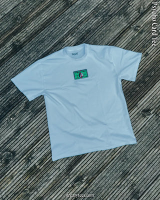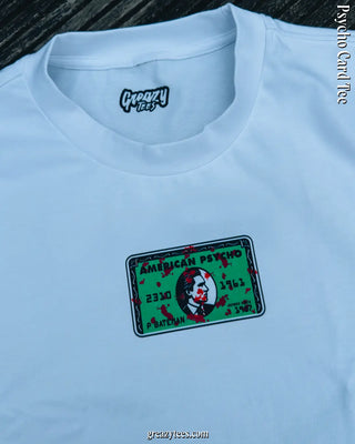Short sleeve cotton t-shirt with Psycho Card front print featuring graphics inspired by the 2000 satirical horror film. Patrick Bateman one of those genre transcending characters you can't help but appreciate, the mixture of horror & comedy in this Mary Harron classic is simply magnificent. Perfected cut for that iconic slightly oversized, boxy fit with a dropper shoulder. It's recommended to stay true to size for an intended slightly oversized fit.