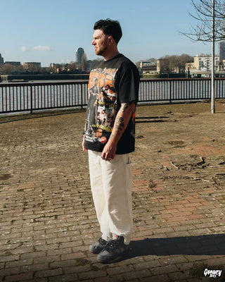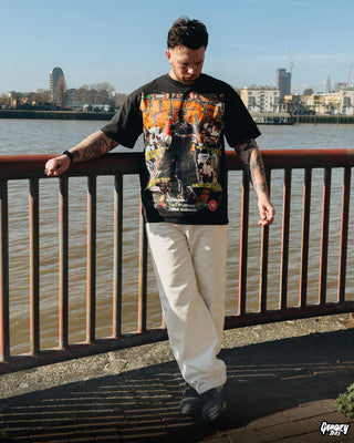 Short sleeve cotton t-shirt with oversized The Wire inspired front and back print featuring graphics inspired by legendary first season of the American crime drama series. Paying homage to some Baltimore legends. Perfected cut for that iconic slightly oversized, boxy fit with a dropper shoulder. It's recommended to stay true to size for an intended slightly oversized fit.